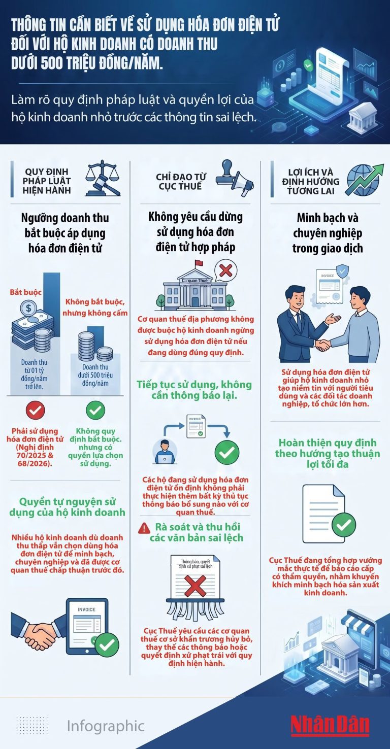 Cục Thuế khẳng định hộ kinh doanh có doanh thu dưới 500 triệu đồng/năm không thuộc diện bắt buộc sử dụng hóa đơn điện tử, nhưng vẫn được tiếp tục