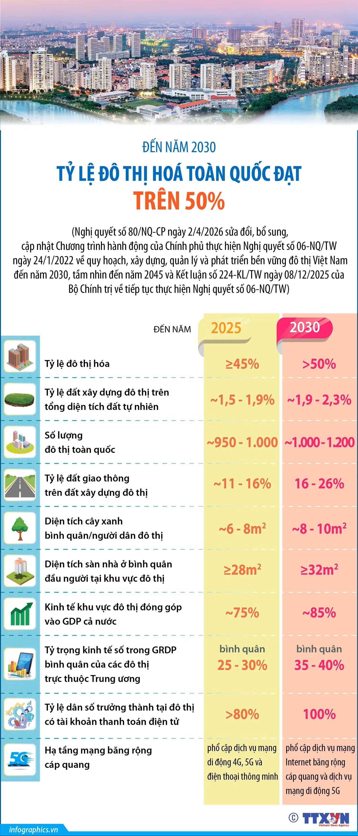Chương trình phấn đấu tỷ lệ đô thị hóa toàn quốc đến năm 2025 đạt tối thiểu 45%, đến năm 2030 đạt trên 50%.