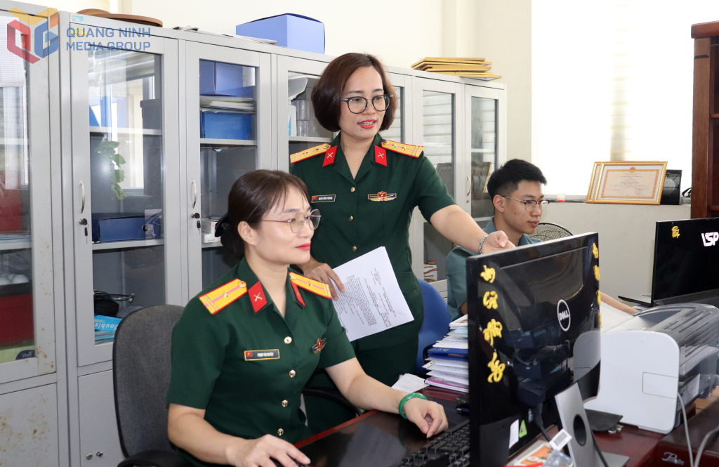 Trung tá Quách Hồng Phương (người đứng), Chủ tịch Hội Phụ nữ Công ty CP 397 trao đổi nghiệp vụ với các đồng nghiệp.