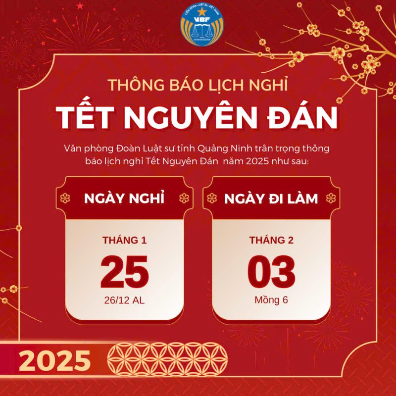 Đoàn Luật Sư Quảng Ninh kính gửi Quý Khách hàng và Quý Đối tác, thời gian nghỉ Tết Nguyên đán 2025: